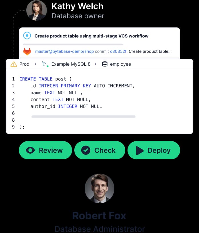 Bytebase streamlines database change deployment from non-prod to prod with review workflow, rollback, and optional GitOps integration.